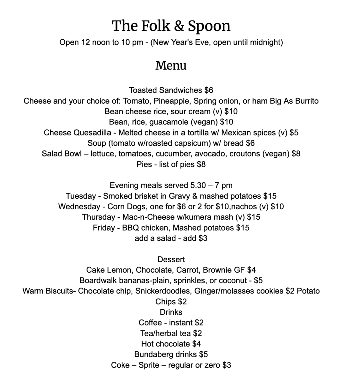Open 12 noon to 10 pm - (New Year's Eve, open until midnight)