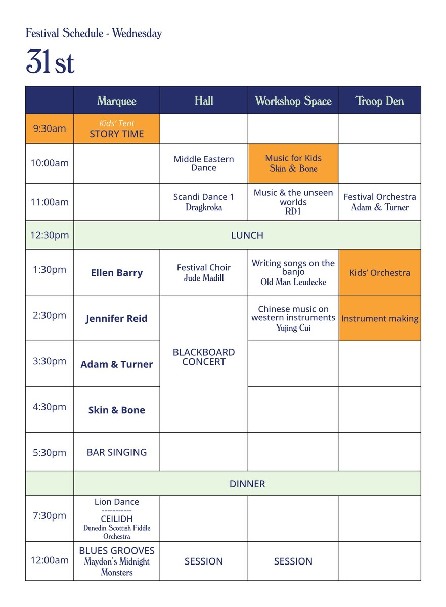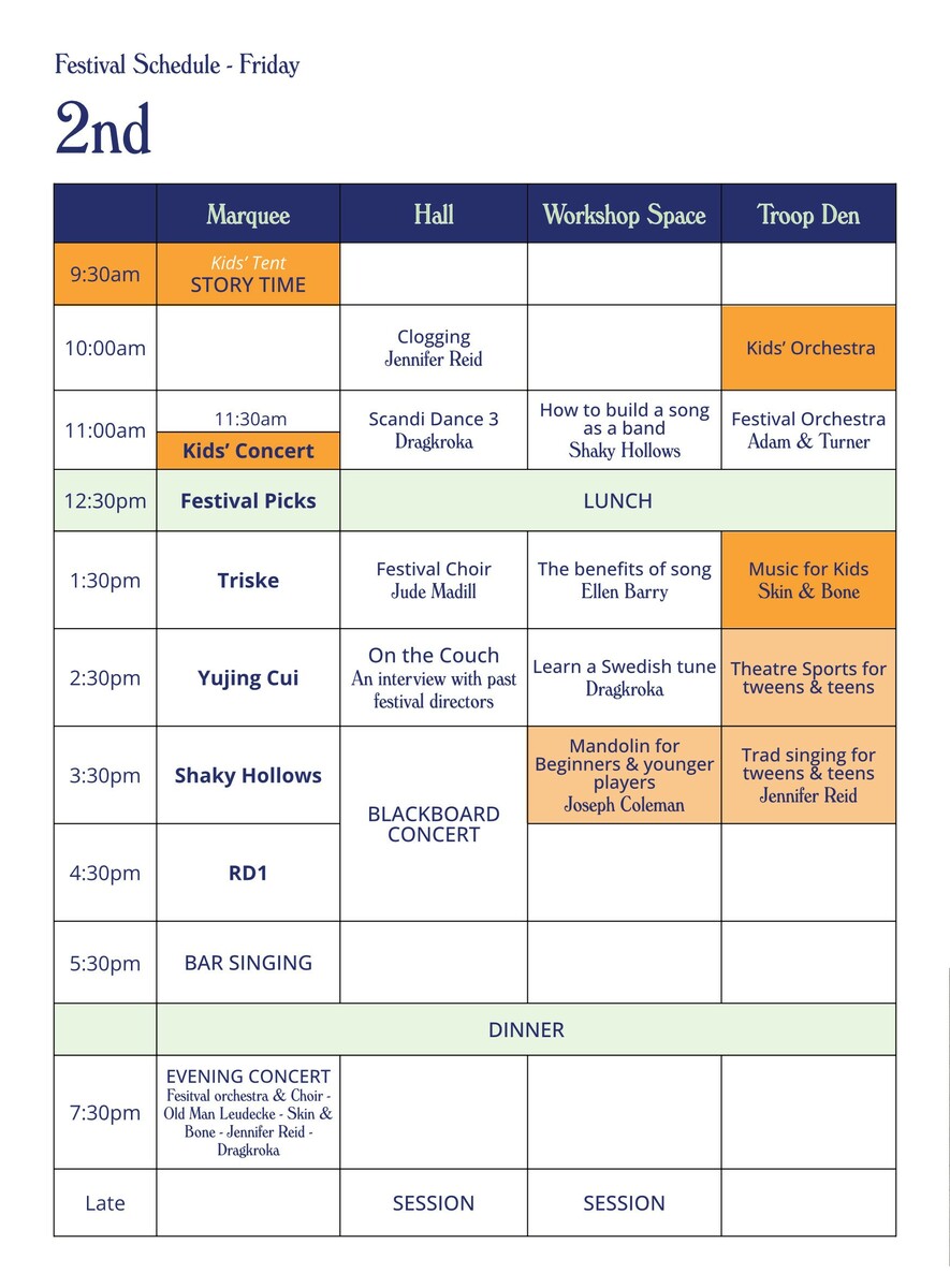 Workshops for singing, festival choir, kid's orchestra, clogging workshops, evening variety concerts, learn a tune, blackboard concerts... it's all happening and we'll tell you all about it.